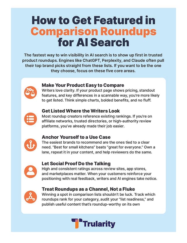 That means publishing use case content that aligns with real queries, showing up in trusted roundups, and making sure your brand is framed as the right fit for the person asking the question.